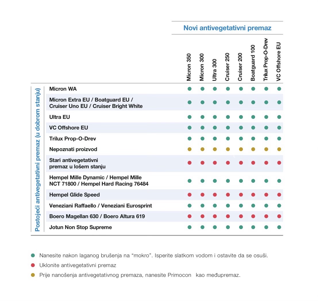 a već imate stari antivegetativni premaz na trupu, morate utvrditi kompatibilnost između ta dva premaza. Koristite ovu jednostavnu tablicu za povjeru kompatiiblnosti između International antivegetativnih premaza i proizvoda konkurencije.